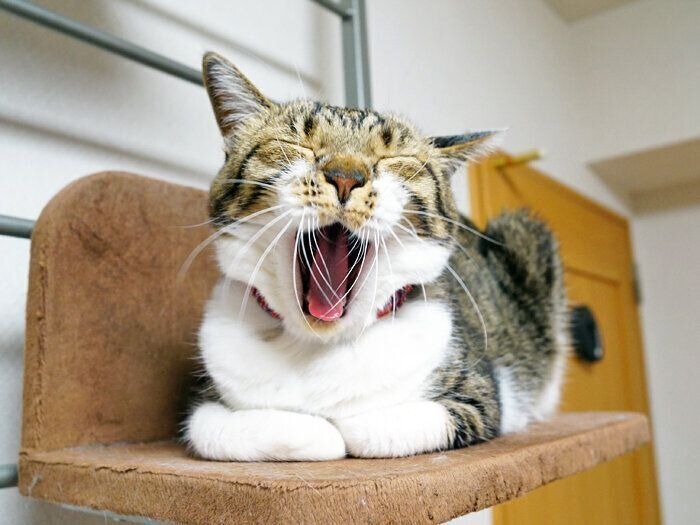 慣れてくると簡単に撮れるようになってくるのはあくびの瞬間の写真。ワタシもはじめは難しかったんですけど、猫ってあくびをする直前口元の『ω』←この部分をモワワと動かしますでしょう?それを見かけたらシャッターチャンス!連写で撮ると、おもしろ可愛い写真が撮れますよ♪