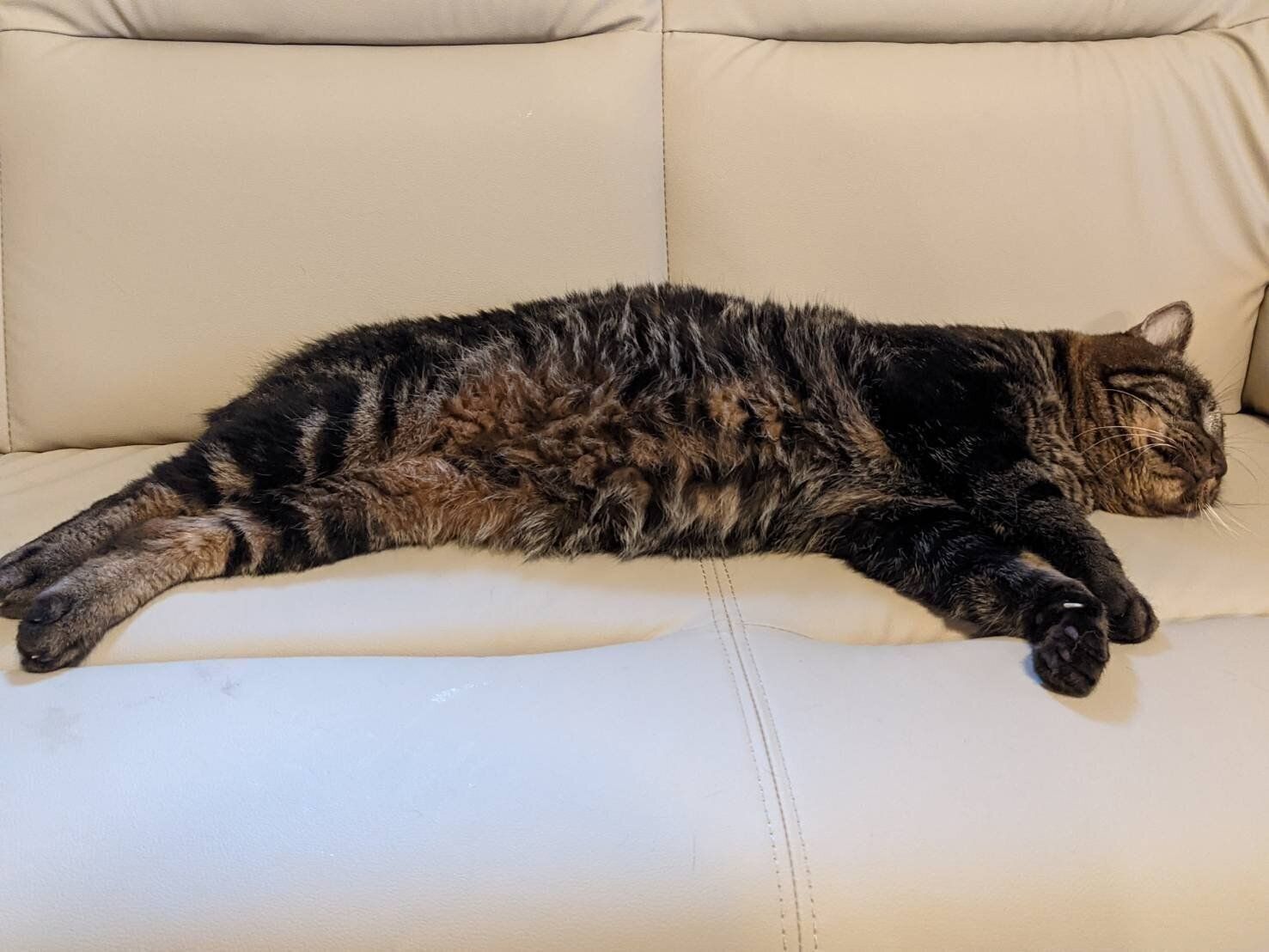 ソファを占領して伸びきった猫様