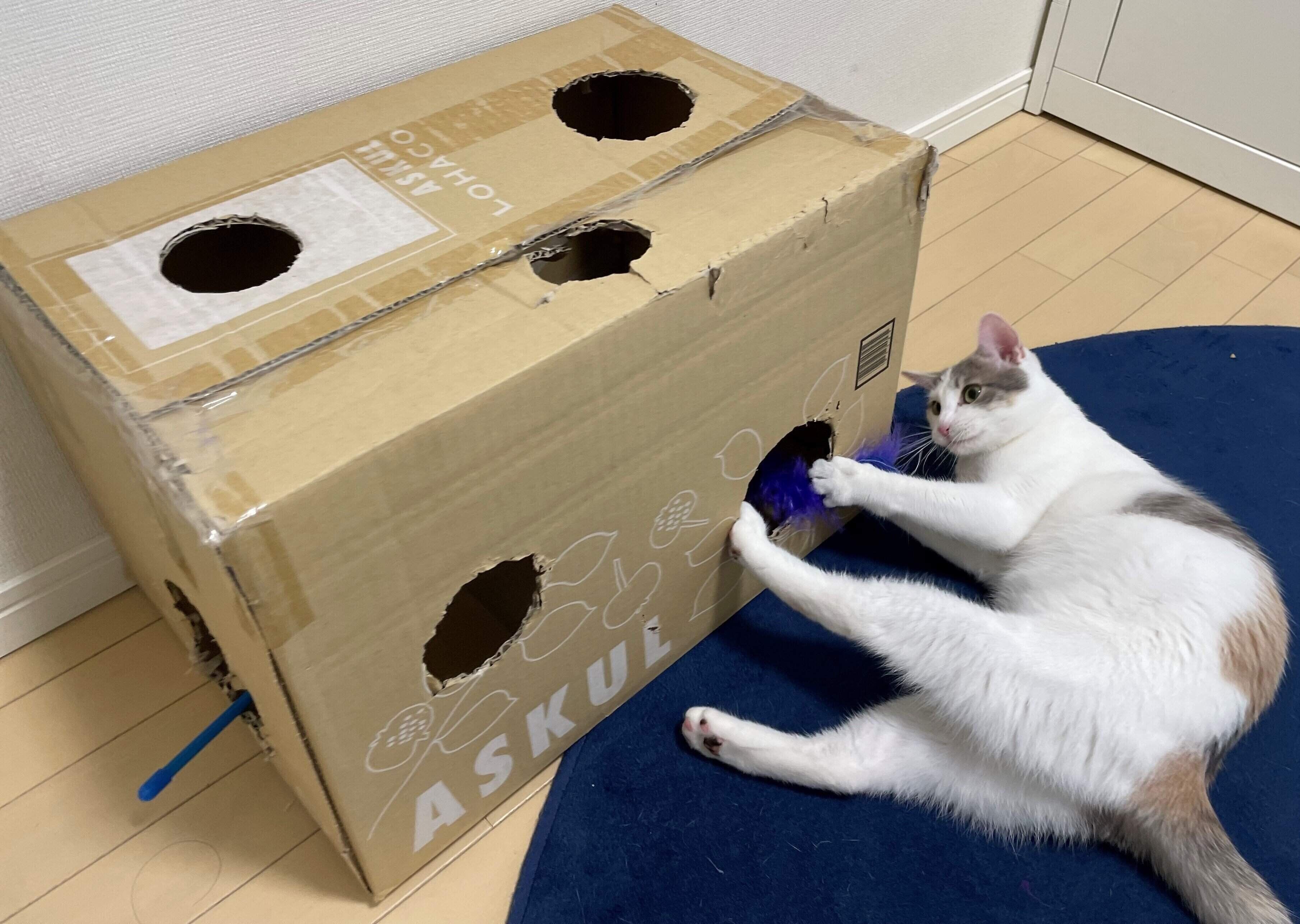 「約横50×奥行き33×高さ30cmのサイズの段ボール箱を使用。2匹が遊べるように丸い穴をたくさん開けて、出入り口用の穴は大き目に。じゃらしおもちゃを箱の中に入れると、追いかけて中に入ったりして、本当に楽しそうでした!」(飼い主さん)