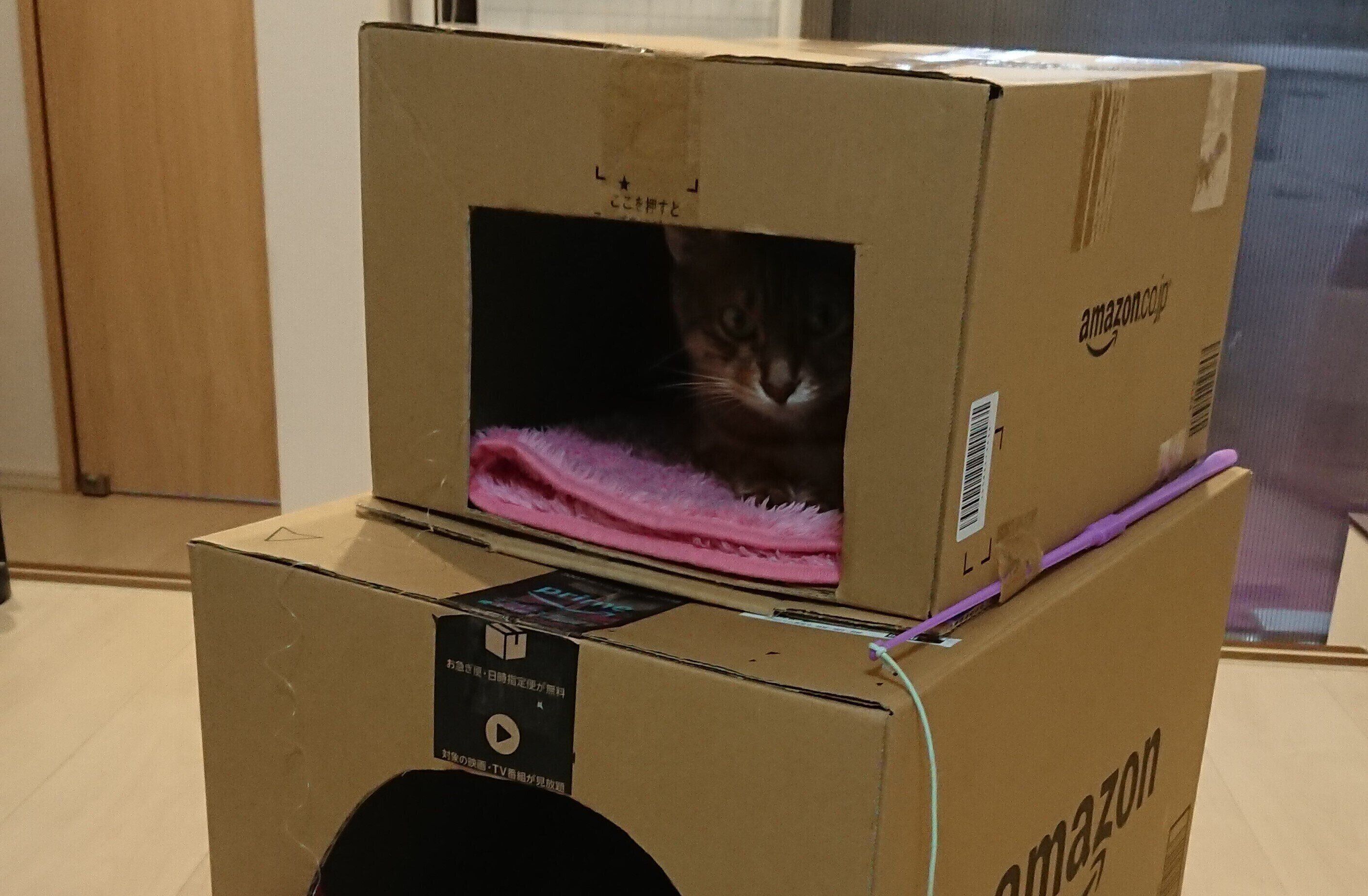 手作りグッズ2/空き箱2個を合体させて「2階建て猫アパート」に!