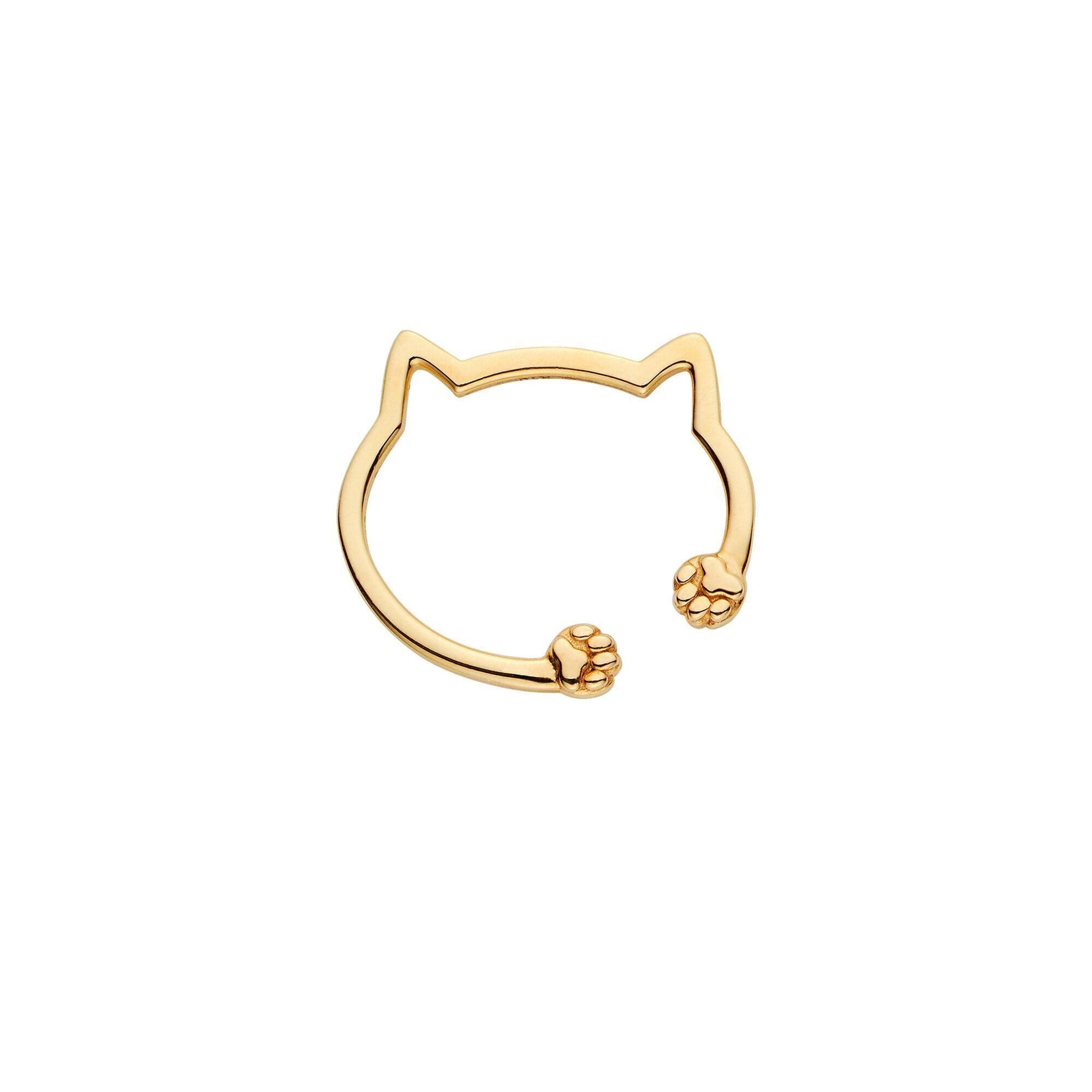 「ネコの丸いお顔とピンと立った耳がキュートな、イエローゴールドのイヤーカフをおすすめいたします。耳あたり部分はクリームパンのような小さなネコの手になっていて、裏側はなんと肉球まで再現しています。
