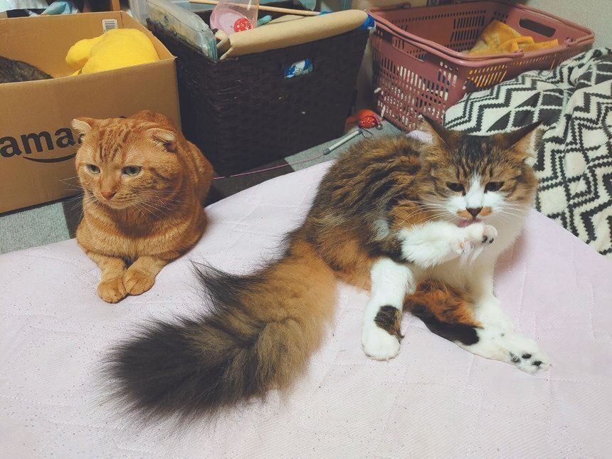 「就寝前、布団にシーツを敷いたあと私と猫たちのどちらが先に横になれるか競争。ただ毎回私が敗北で、猫たちが先にのっています。私は隅のほうで寝るしかありません(笑)。」