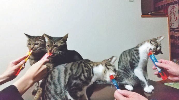 「複数飼いなのでおやつタイムは奪い合いにならないよう工夫が必要です。写真では夫と手分けし、同時に4匹に与えることに成功!」