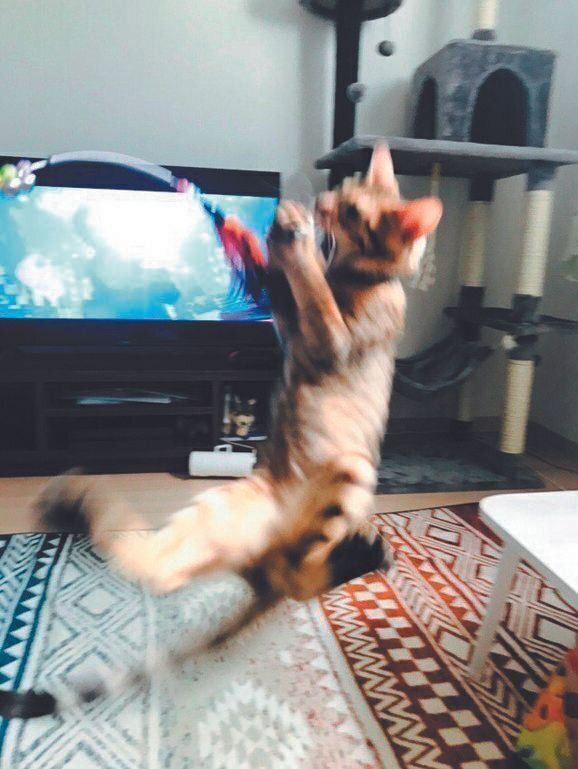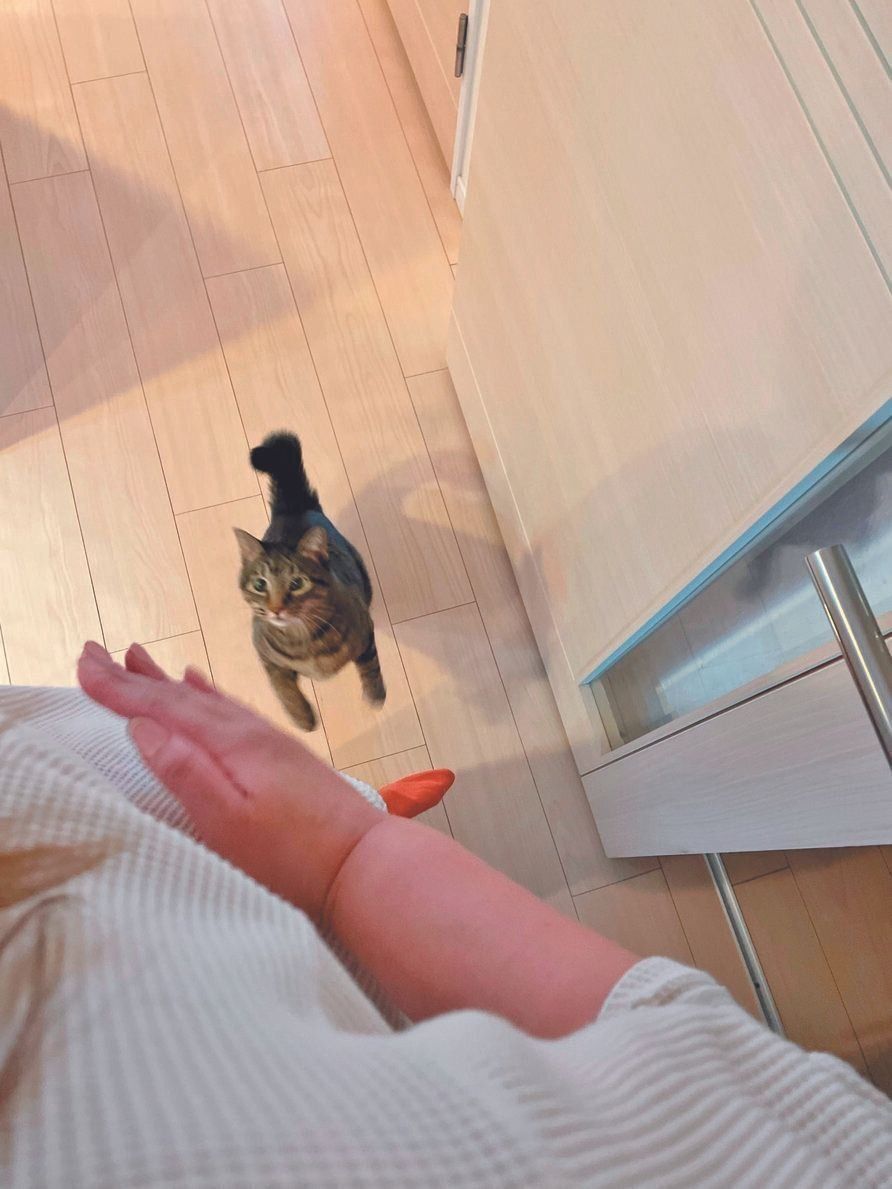 「うちのコが夢中になるようにじゃらしおもちゃやリボンを動かします。その動きはまるで新体操! ツナがおもちゃに飛び付くまでのタイムも自己ベストを目指しています。」