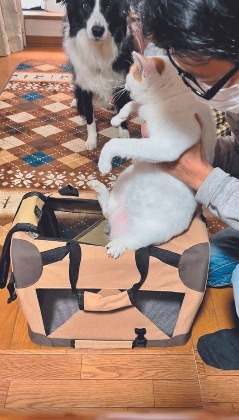 「通院の際、愛猫をキャリーケースにうまく入れられるかは人間の腕次第。全身スッポリ入れられたら成功ですが、もちづきが足を突っ張ったりしてうまく入れられないときが。愛犬が審判役です(笑)。」