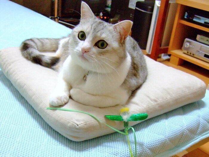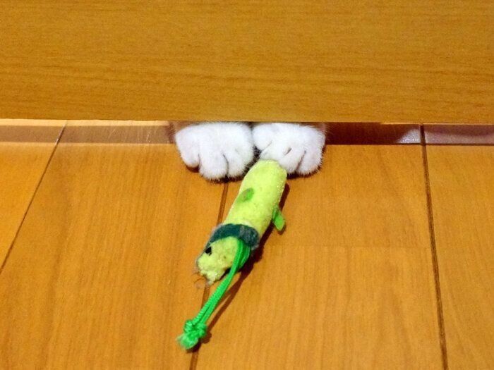 その昔、うに・もも・てんの3猫を、盗み食い防止のために別々の部屋で夜寝かせていたときも、てんちゃんが閉まっているドアを開けてほしくて『これあげるから!』と、猫じゃらしを持ってきてましたもの。