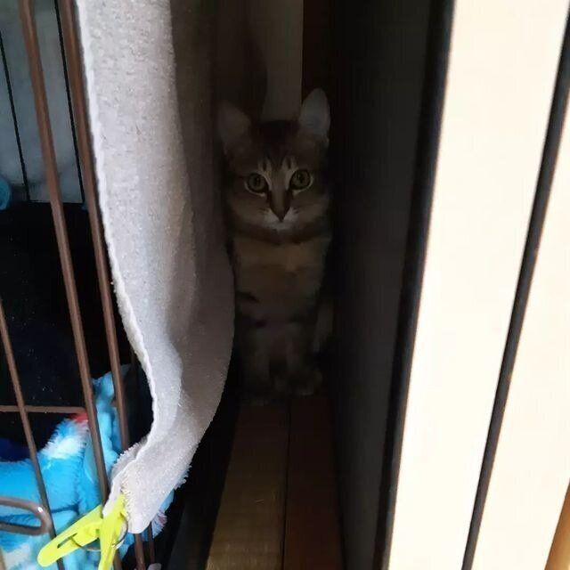 猫に会いに行くと、人慣れをしている猫たちの中、人目に付かないようなキャットタワーのハウスの中でダンゴムシのように丸まっている子猫(当時生後約5か月)を発見! そーっと指を差し出してみると、さらに縮こまってビクビク。