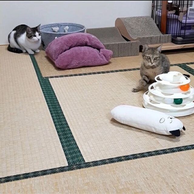 最もハードルが高かったのは小雪ちゃんが閉じこもっているケージから出てくること。おもちゃの動きにつられ、恐る恐る出そうで出ないを繰り返すこと数十回、やっと、初めて小雪ちゃんがケージから出てきました。もちろん、その間もごまちゃんがずっと見守っていました。