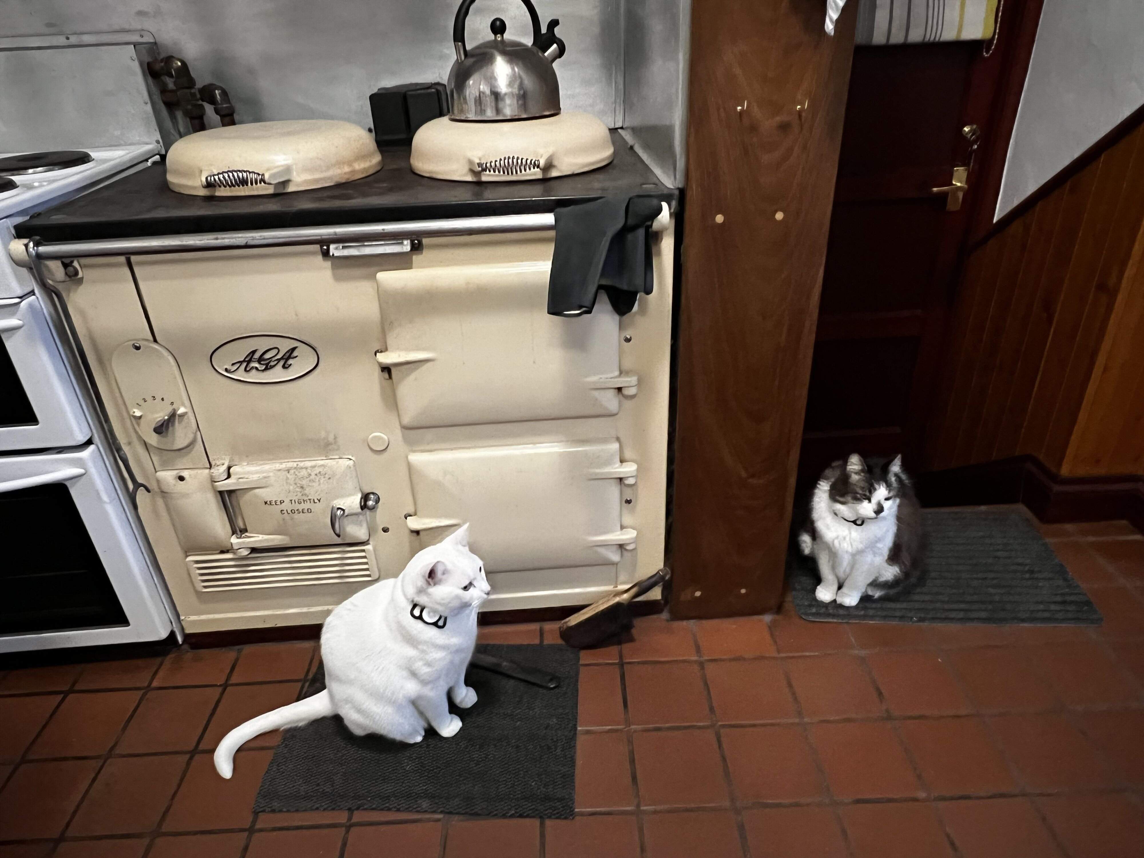 現在は、新居の中に2匹のお気に入りの場所もできました。AGA(アーガ)という、イギリスの伝統的な古いストーブ・オーブンの前です。オーストラリア出身のウィスキーちゃんも、アメリカ出身のルーキーちゃんも、すっかりイギリス猫になりつつあるようです。