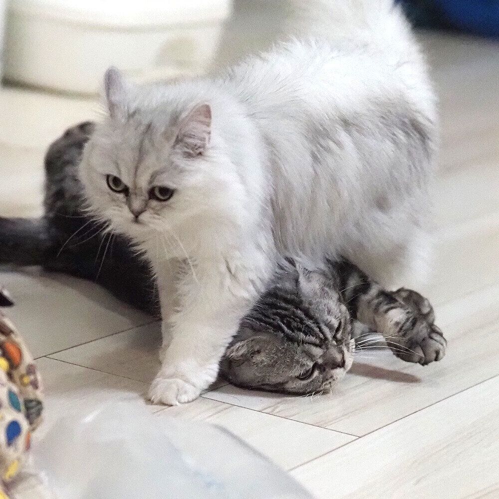 ししまるが寝転がると、まるこは上から猫パンチ。始めは乗り気なししまるでしたが、まるこの瞬発力と体力であっという間に劣勢に。そして”もう勘弁”のゴング「シャー」を自分で鳴らして、逃げていきました。