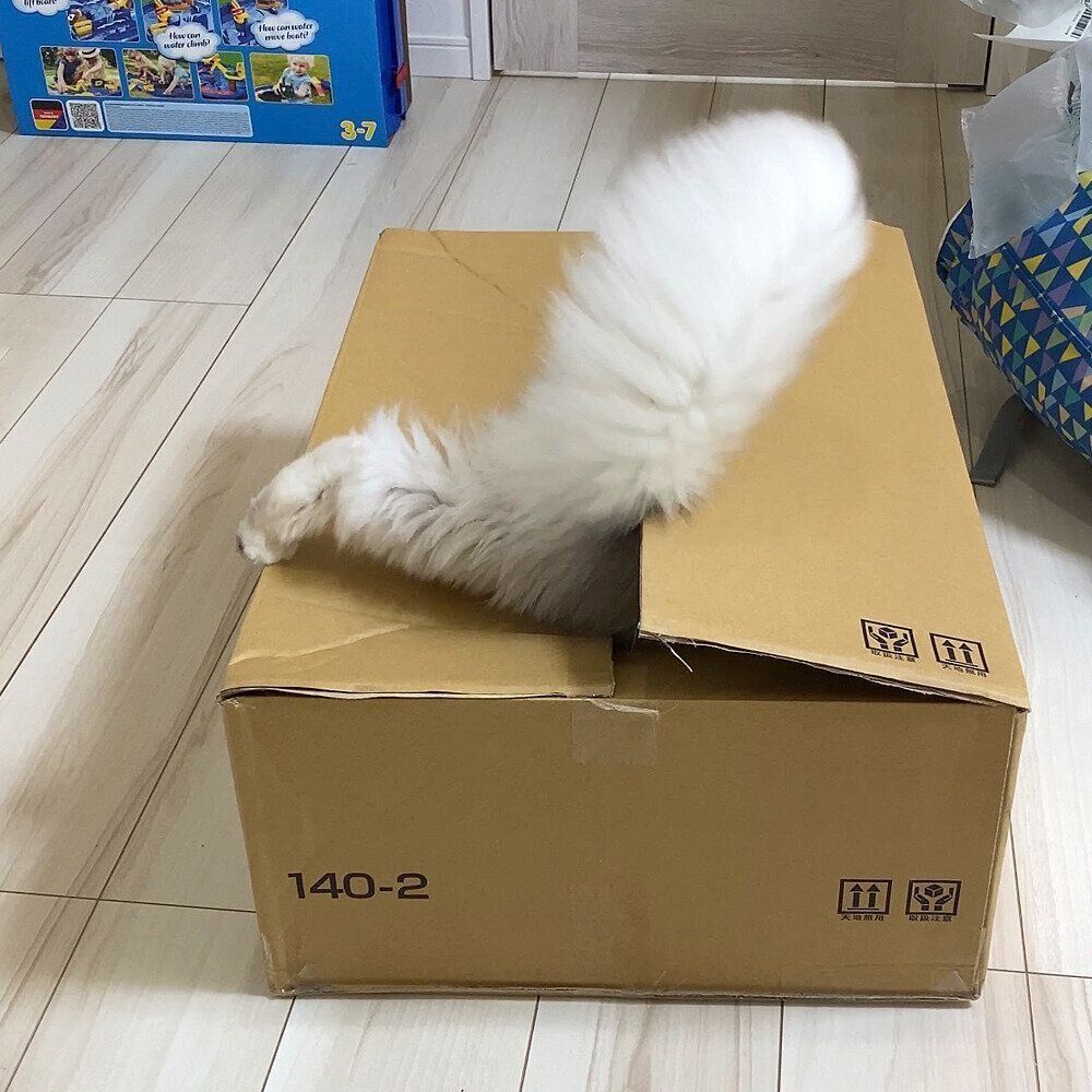 先日、ししまるはちょっと大きめの段ボールをゲットしました。段ボールの音が聞こえると、小走りで近づきフンスンと品質チェック。慎重な猫であります。