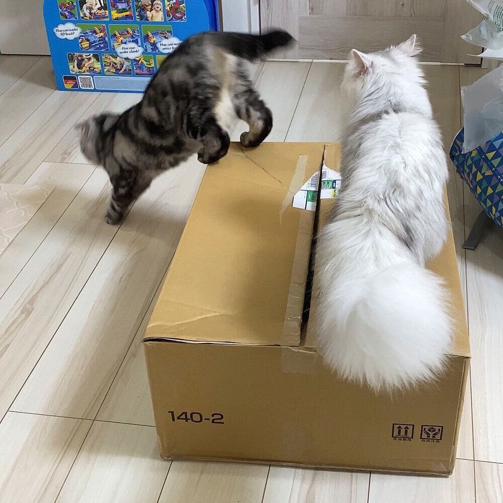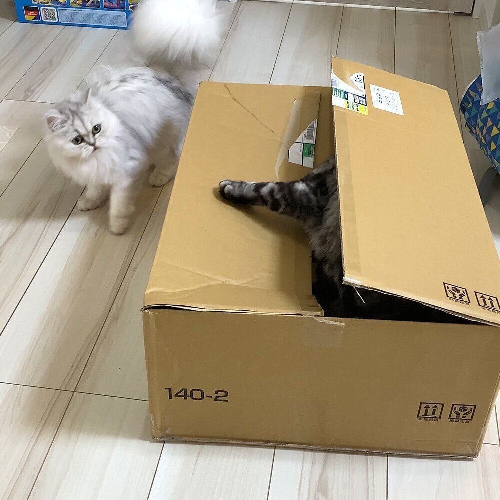 人間にとってはとても邪魔なビッグボックスですが、猫たちの楽しむ姿を見てしまったので、しばらく置いておくことになりそうです。