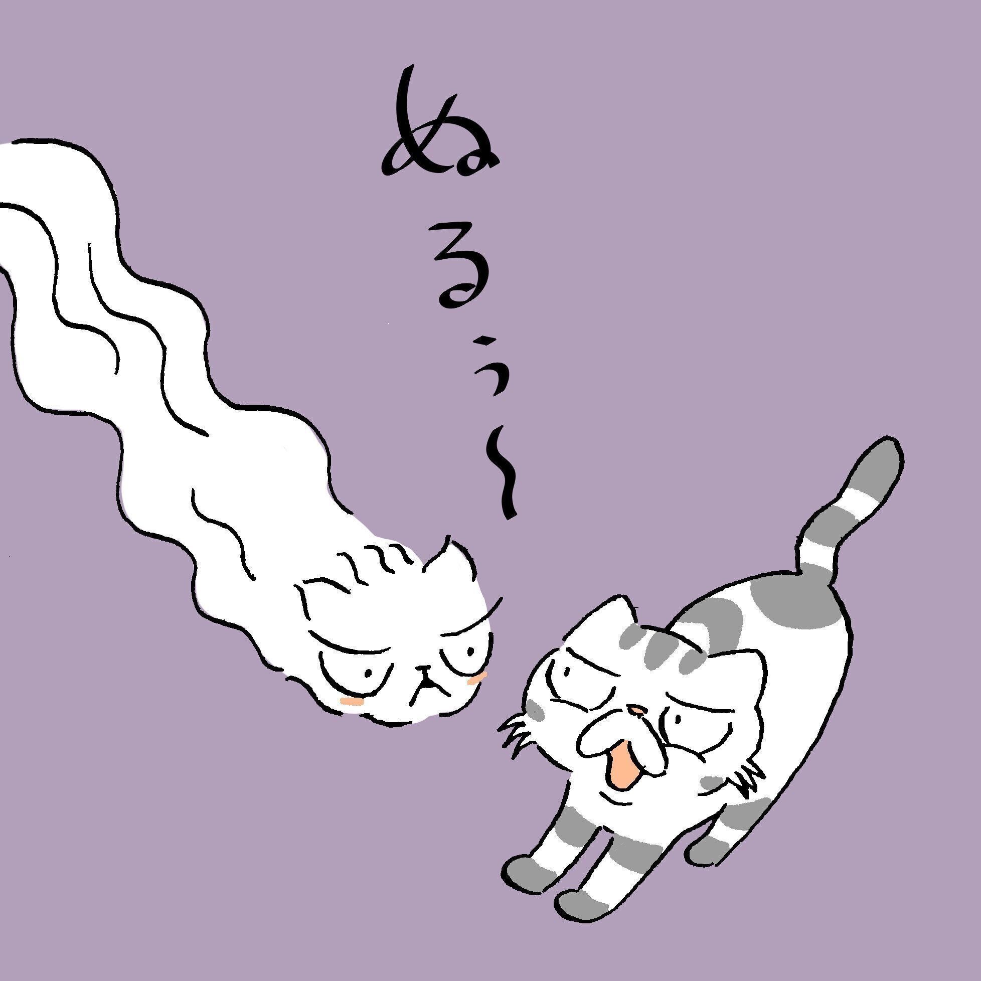 そこへやって来たのは、妹分まるこ。彼女は“とろろ“のように2階から流れ落ちて来たかと思うと、段ボールのフタの隙間からスッと中に滑り込みました。