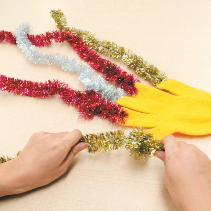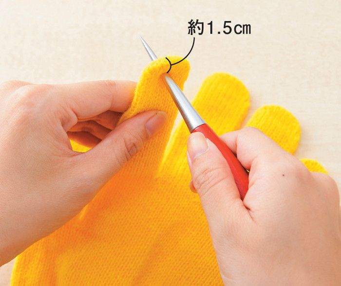 1.手袋の指先から1.5cmほどの位置に、きりでそれぞれの指に穴を開けます。