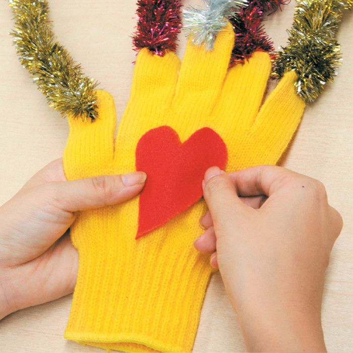 好みで、手袋の甲部分にフェルトやワッペンなどをはると、さらにかわいく、クリスマス気分が盛り上がりますね。写真では、真っ赤なハート型のフェルトを接着剤で貼りました。