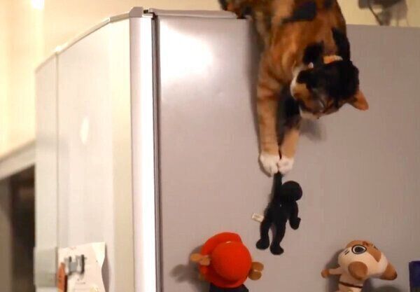 冷蔵庫の上に乗ったひじきちゃんは、左の前足をぐいーーーんと伸ばし、ショッカーを捕まえようとしています。