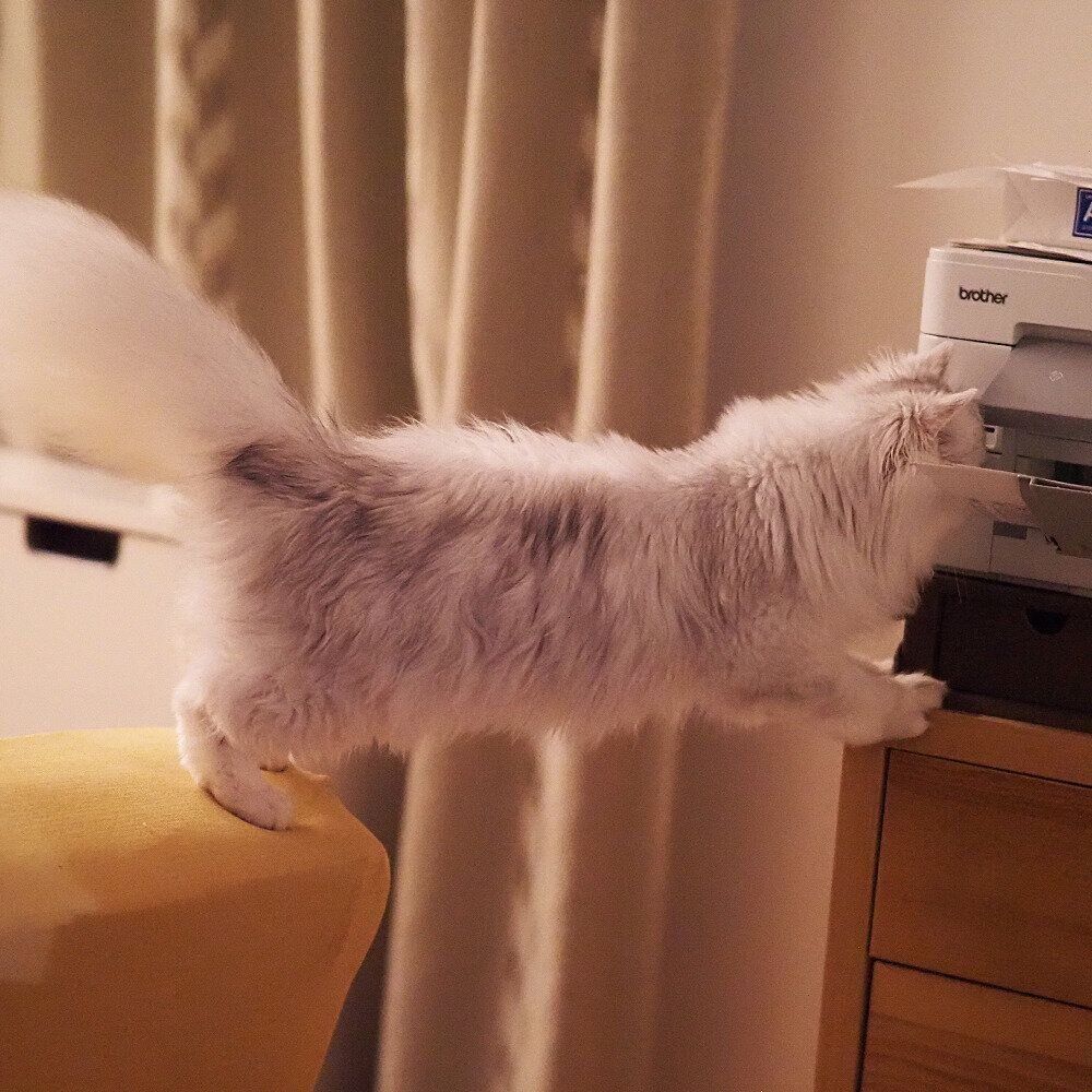 でもまるこはすぐに戻って来て、プリンターの上に寝転んだ。