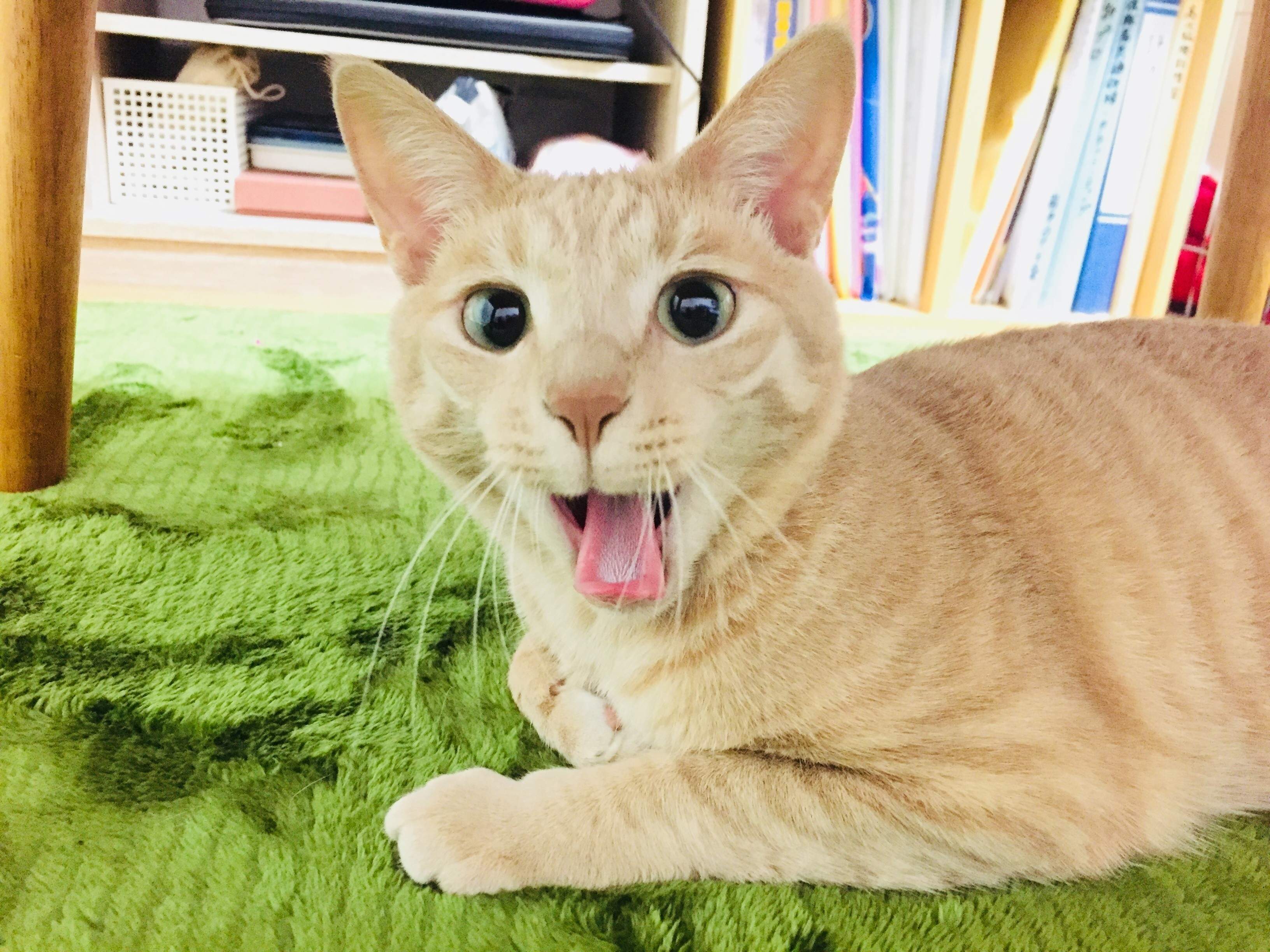 しま模様が全体的に薄いと「薄茶トラ」といいます。写真は、あくびの途中と思われる猫。目線もあり、牙も見えてないせいか、とても愛らしい顔をしていますよね!