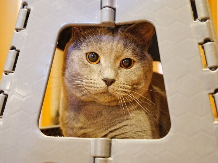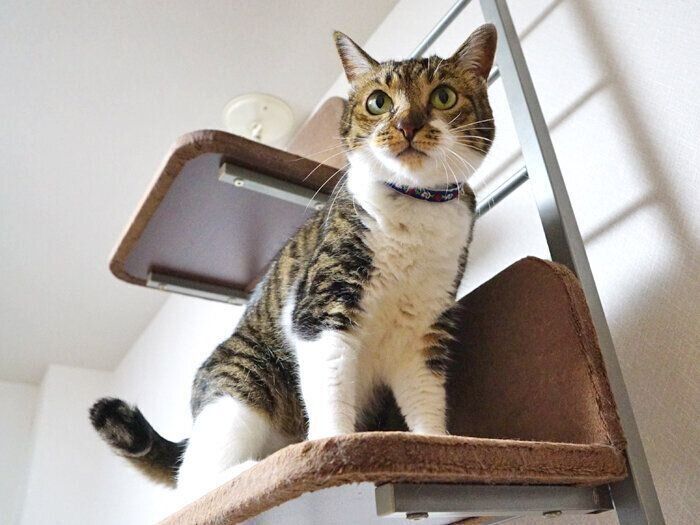 怖がりな性格のてんちゃんも、昔はムームー君と同じようにシュバッ!と隠れていたのですが、ここ数年は隠れるどころか『あなた誰?ここはてんちゃんのおウチですけど?』と言わんばかりの態度で、堂々とキャットウォークの上から点検の方を見下ろしているのですよ。どうした、てんちゃん!なぜ急に強気に!?