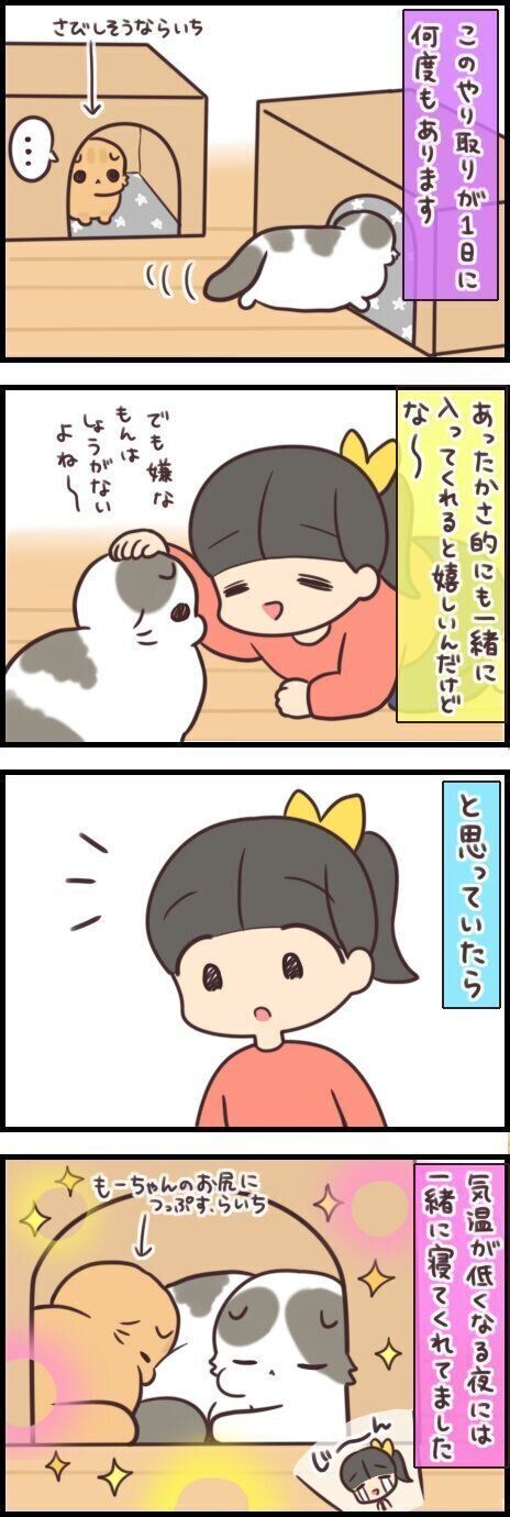 湯たんぽ代わりになってくれるもーちゃん、なんやかんや優しいんです(笑)