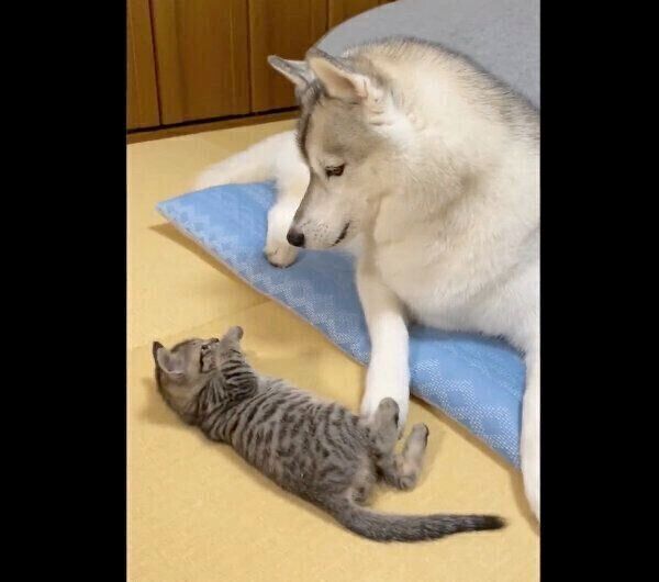 「ヤキモチを妬いているみたいで可愛いなと思いました。以前、ユキの上にハスキーのぬいぐるみを置いたときにも、サンは同じようなことをしていましたね」