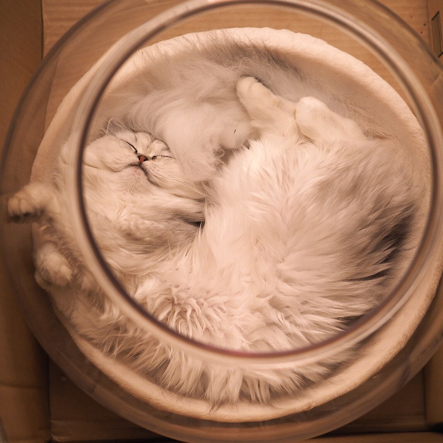 昼。ししまるは箱で、まるこは透明な鉢で過ごす。2時頃になると、二匹はコクリコクリと舟を漕ぎ始める。