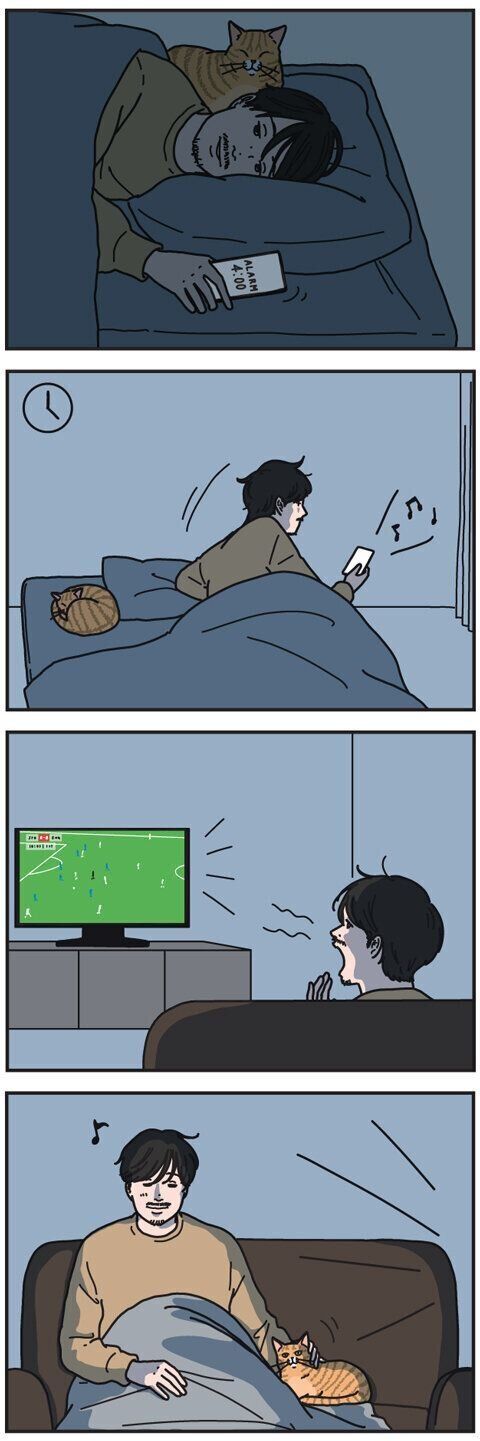 眠たい目をこすりながら寝室からリビングに行くと、一緒に寝ていた猫たちもゾロゾロとついてきてくれて、ウトウトしながらも一緒にサッカー観戦してくれました。