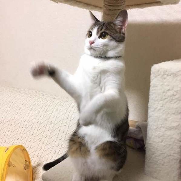 大きなもので警戒している時には、顔と体を後ろに引きます。人間でいうと腰が引けた状態でしょうか?そして、【ちょいちょい】よりも、もっと大きな動作でたたいてひっこめます。そう、一種の猫パンチですね!