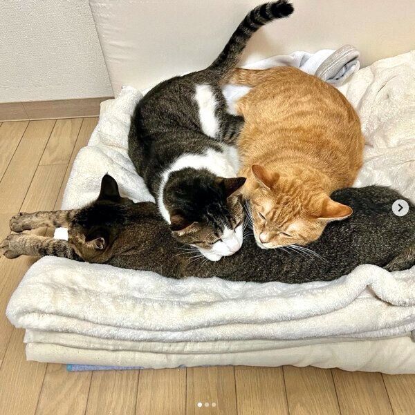 「あの動画を撮影する前、マイレはお兄たちの間に入れなくて、ひとりでスネていたんです。うなうな鳴いていたので、お兄たちの上にマイレを置いておなかをもみもみしてあげていたら、眠くなってきたのかあのポーズをしていました」
