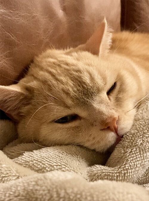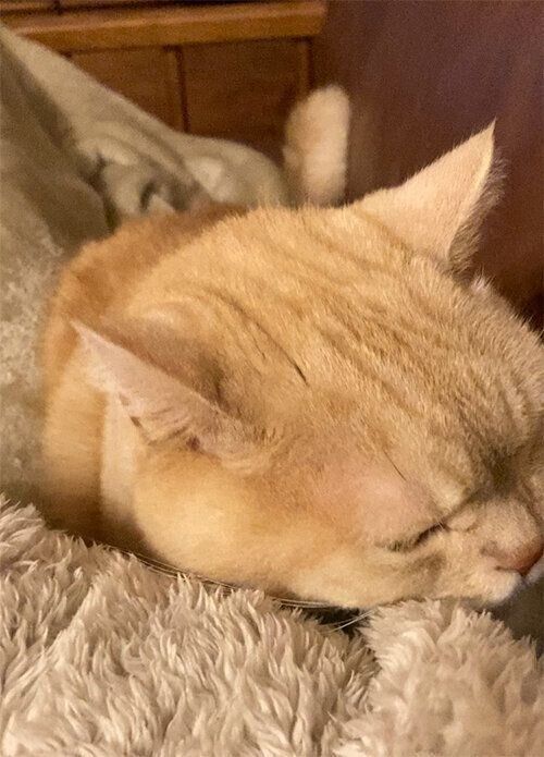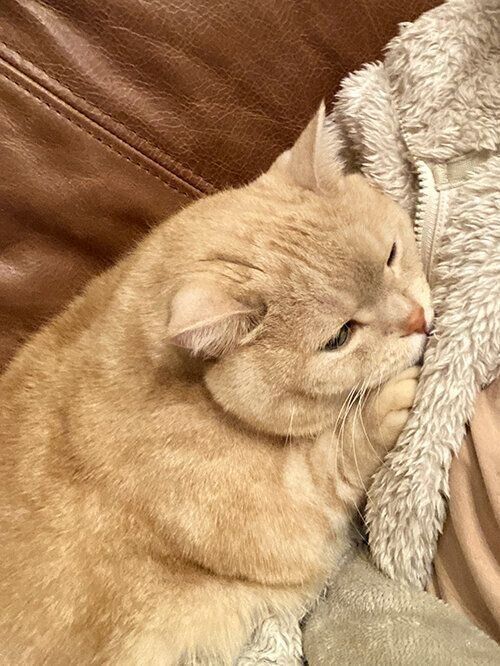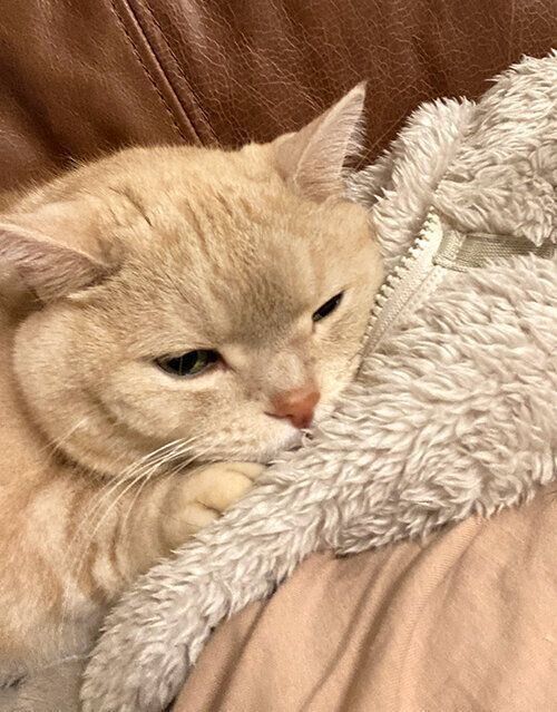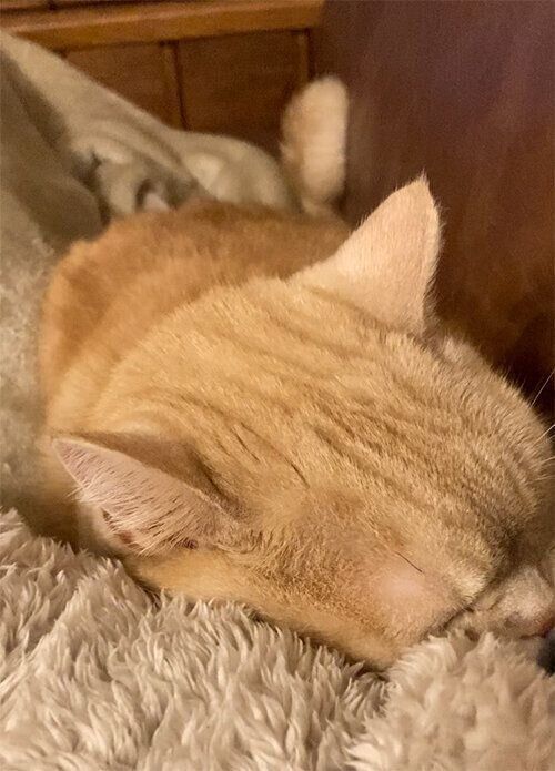 いつもは飼い主の足元やお腹らへんに丸まっているのですが
