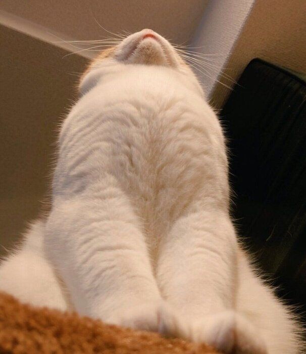 ケースに入ってくつろぐ愛猫のおちゃまるくんを後ろから撮影したものなのですが、ケースのふちから垂れるもふもふもっちりなお肉は、まるで「おもち」そのもの!?