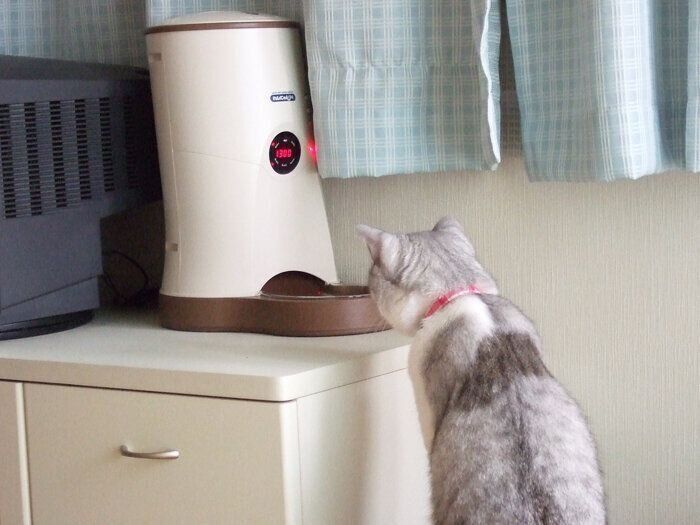 ワタシが使っていた自動給餌器は、ゴハンがザララーと出る前に、曲が流れるタイプだったんですけども、うにはその曲が聞こえるやいなや、シュバッ!と自動給餌器の前にすっ飛んで行ってましてね。見事に自動給餌器を使いこなしていたので、ワタシも安心して残業時のゴハン準備を自動給餌器にお願いしておりましたよ。