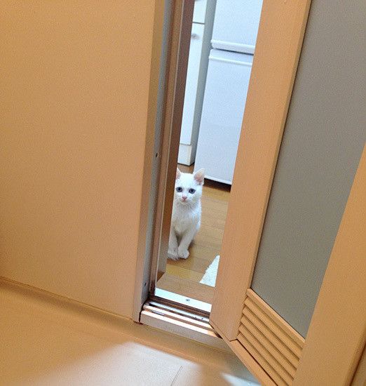 お風呂から出ると扉の前で “ちょこん”。