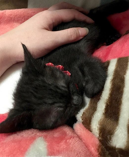 ヨミィ。1カ月。うちにきた奴らの中では最年少です。ちょうど乳離れくらいの時期で、歩くのもおぼつかずよたよた。あっち行ってこっち行って気づいたらコテンと寝こける。コロコロ転がるように移動して何にでもよじ登ってみる。たどり着くのは大概私の頭頂(とうちょう)です。