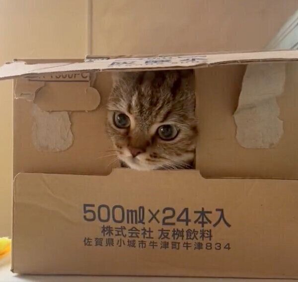 ダンボール箱から顔を「ヒョコヒョコ」させる猫 「狙ってやってる!?」としか思えない行動に胸キュン!
