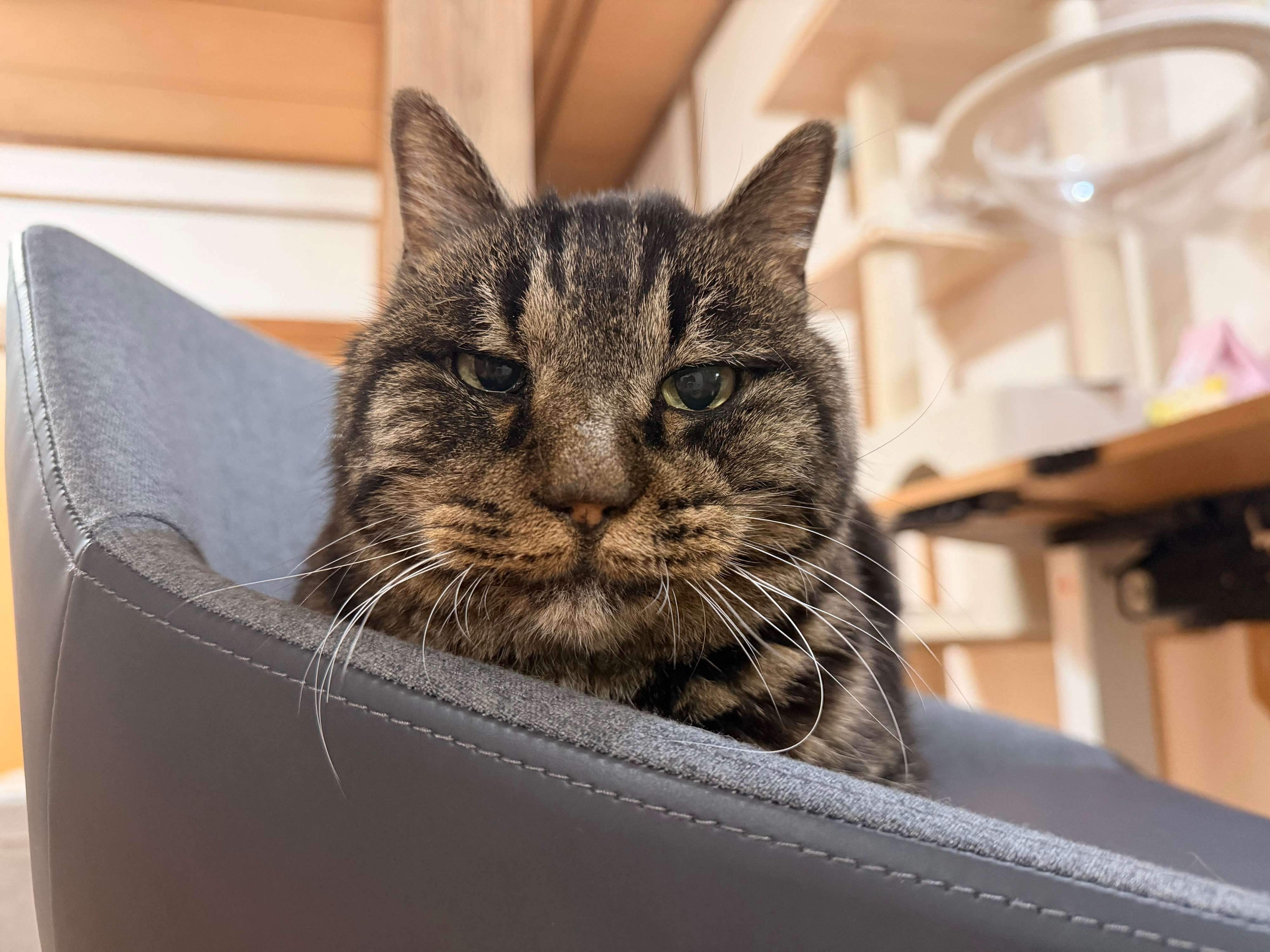 スマホの横から、ぴたりと視線を送ってくるたまちゃん。