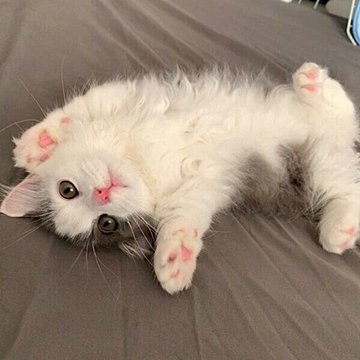 こちらは、お迎えする前、生後1カ月のころに初めて対面したときの一枚です。真っ白で、綿毛のようにパヤパヤした毛並みがとても可愛らしかったというミントくん。