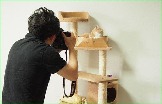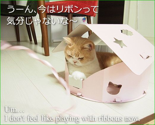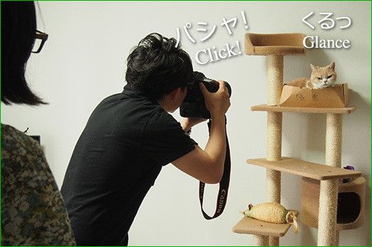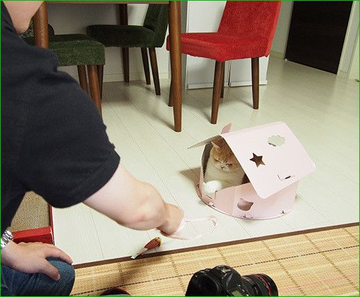 お客さまのニオイをひととおり嗅いだ小雪は、マイホームでくつろぎ中。カメラマンさんがじゃらしてくれますが、あまり乗り気ではありません。