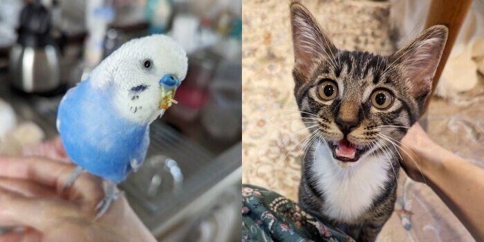 飼い主さんのおうちでは、同じくセキセイインコの男の子で2歳の「エリザベス(通称:リビ)」くんと、2023年8月、新たにお迎えした生後6ヶ月の男の子で元保護猫の「バリー」くんと一緒に暮らしています。