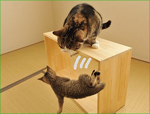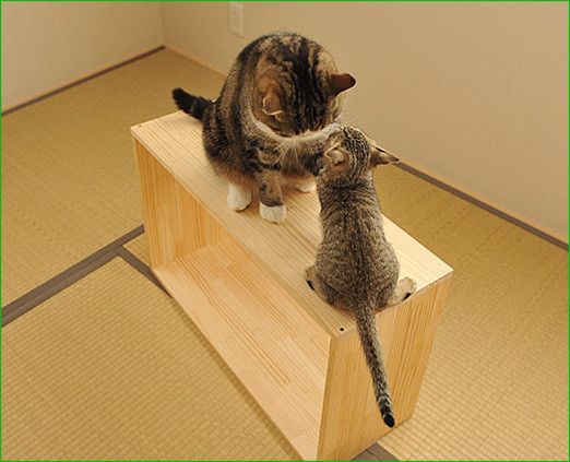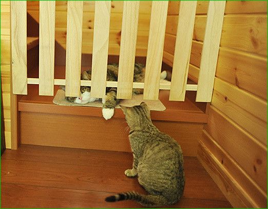 しばらくすると慣れたのか、行きも帰りもジャンプできるようになりました。しかし、絶賛成長中のはなさんも気づけばジャンプ可能に。こうしてまるの安住の地は日々失われつつあるわけですが、1階での追いかけっこに2階への動線が加わり、2匹の運動量は著しく増加。ということで、めでたしめでたし!