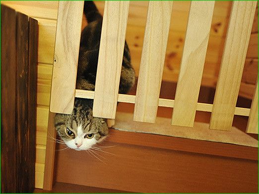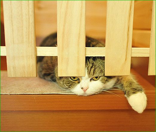 2階に行く時は軽やかにジャンプして跳び越えて行ったくせに、戻ってきたらなぜか柵に阻まれて出られないまる。そして勝手に閉め出された形に。
