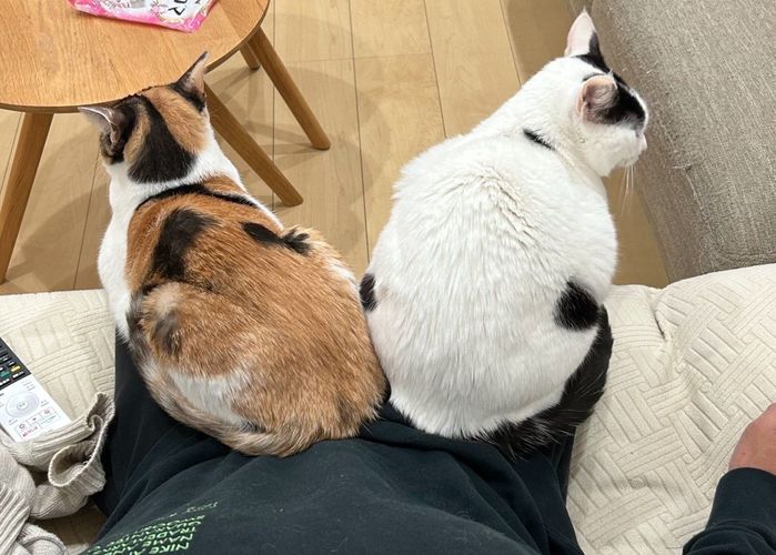 飼い主さんに話を聞くと、写真はとある日の寒い朝に撮ったものだそう。飼い主さんが出勤の準備をしようとしていたところ、2匹が暖かさを求めて膝の上にやってきたのだとか。