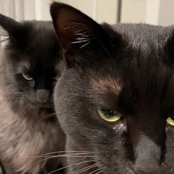 「夜に帰宅したとき、暗い部屋に入り電気をつけると目の前にふたりが座っていて、暗闇だとまったくわからなくてびっくりしたことがあります。机の下にいるのに見えず、うっかりしっぽを踏んでしまって怒られたり。