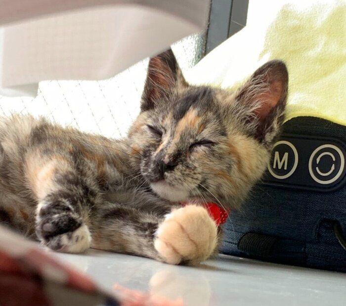 全力で遊んだ後のきなこちゃんは、“ヘソ天”ポーズでぐっすりと眠ってしまう姿がよく見られたそう。「おててを触っても目を覚まさないくらい爆睡していました(笑)」と、飼い主さんは話しています。