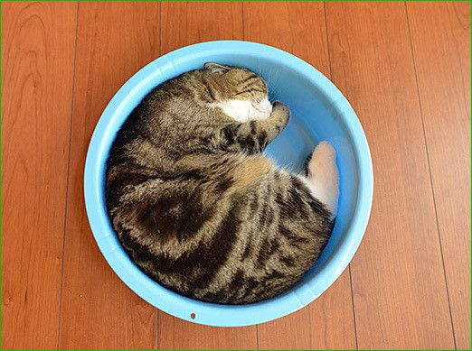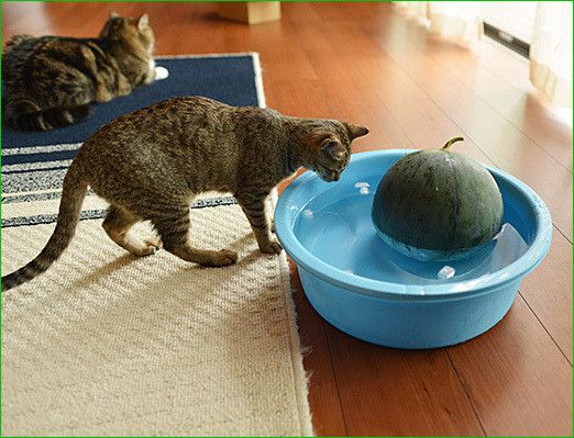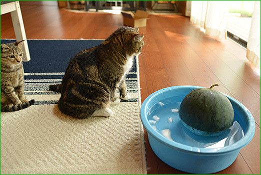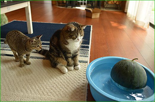はなはスイカを冷やすために入れた氷に興味をもち、まるはどうやら、大好きなタライに変なものを入れられてすねた様子。