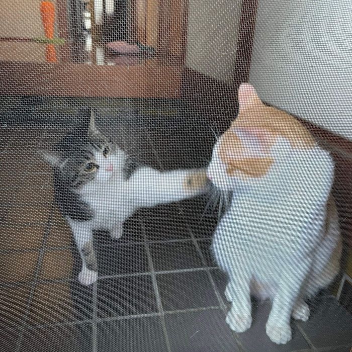 先にはなちゃんが爪とぎ器でコロコロしていると、あとからおーちゃんがやってきたのだとか。おーちゃんははなちゃんの隣に置かれた爪とぎ器に乗るのですが、その様子を見た飼い主さんは笑ってしまったといいます。