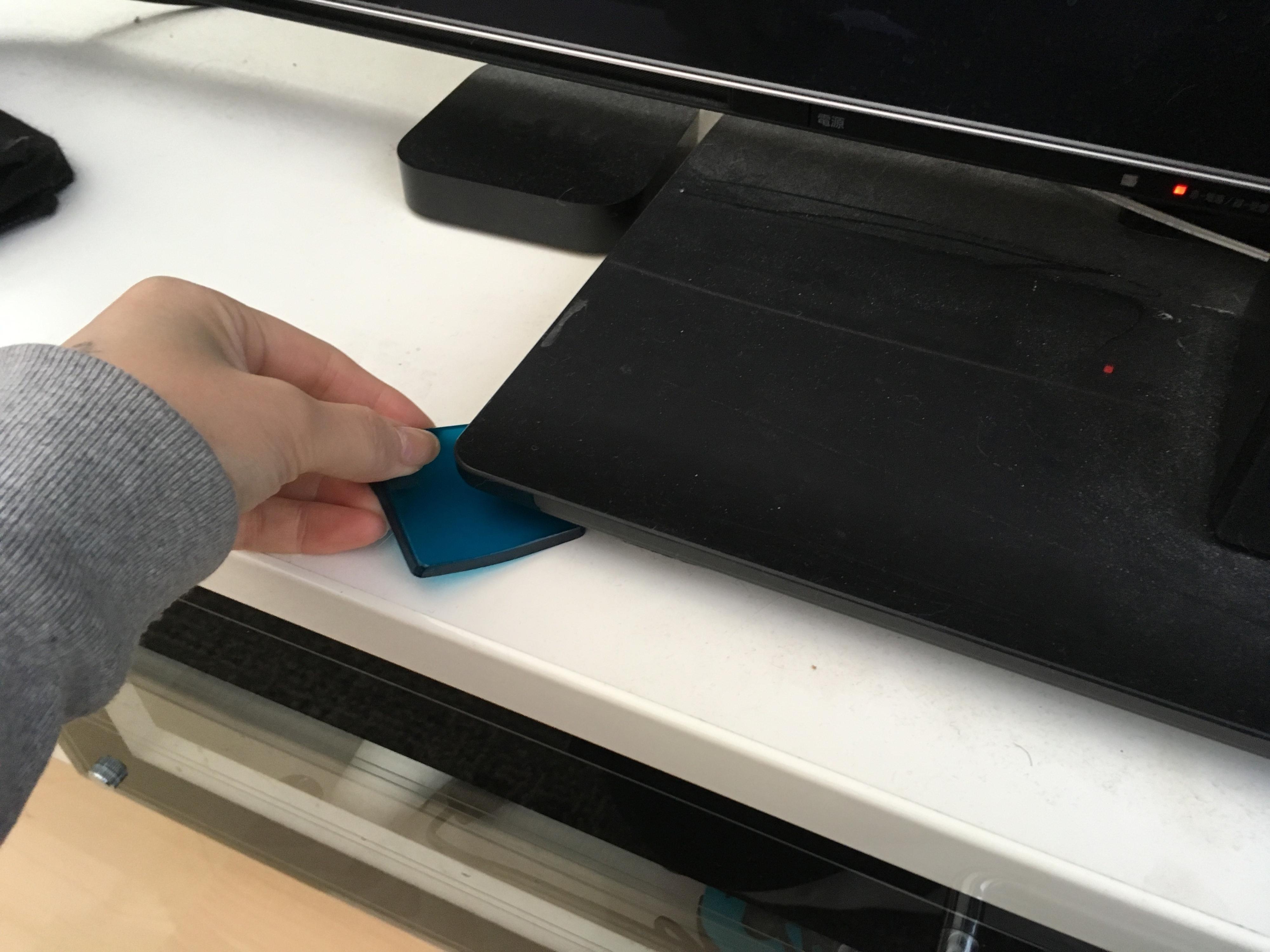 まずは、一番倒れたら(安全面でも、そして金銭面でも)怖い家電の滑り止め。わが家では、引っ越しの際にもらった、上の写真のような滑り止めシールを、家電の四隅に貼っています。ゼリーっぽい質感なので、密着度も高く、全面に貼らなくてもしっかりと家電をホールドしてくれている気がします。接着テープで貼るわけでもないので、取り外しも簡単&跡が付かないのも嬉しいポイント。100円ショップなどでも売っています。