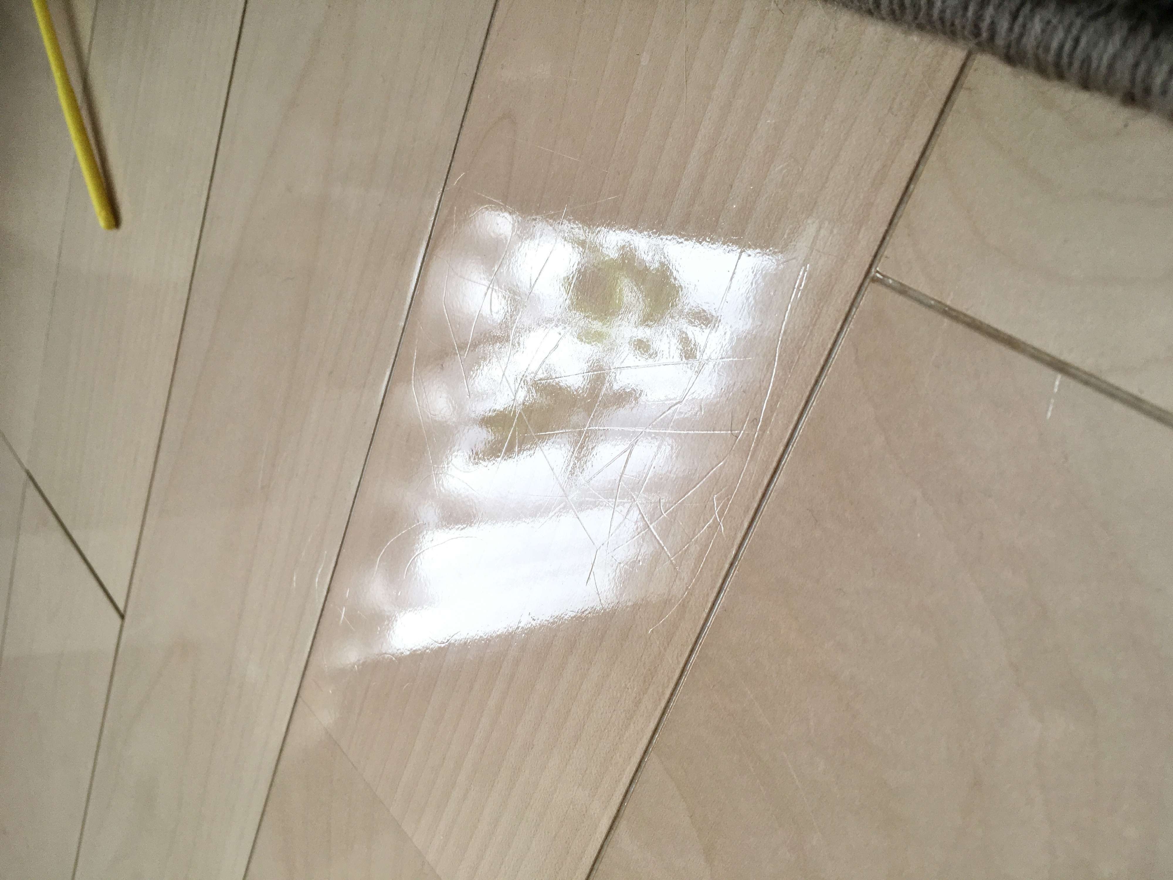 ラグを敷いていないところはこのように爪跡だらけでボロボロです……涙。このラグは重みがあるので平気ですが、サイズによってはやはり滑り止めシートを敷きたいですね。