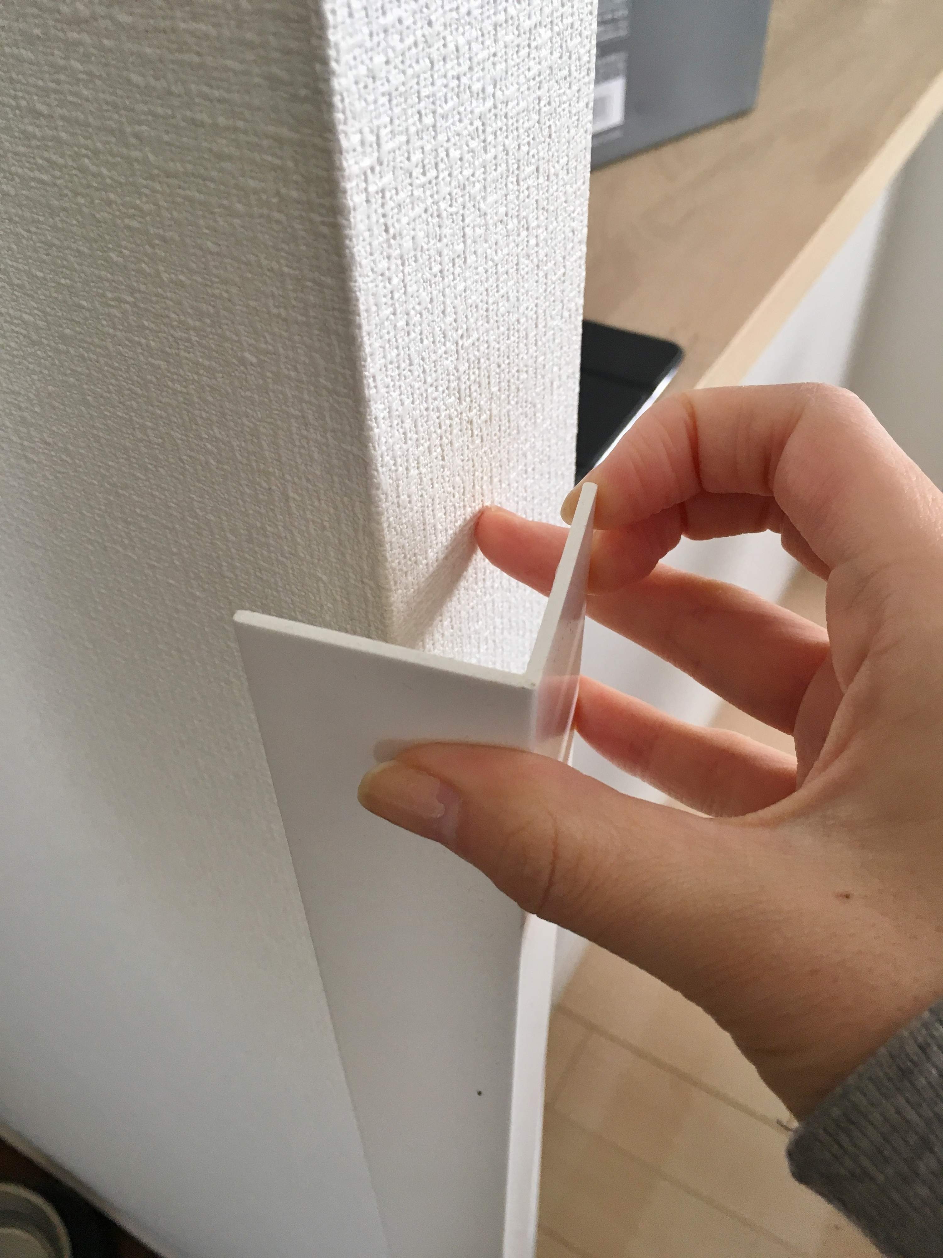 部屋の壁が真っ白なので、引っ越してすぐに壁の対策をしました。本当は壁全面に何か策を施すに越したことはないと思うんですが、ビジュアル面も考慮して、わが家は壁の角だけに対策を。爪とぎもイヤですが、スリスリって意外と黒ずみができるんですよね……。ホームセンターで売っている、写真のようなプラスチックのバー(?)を、猫が爪をといだり、スリスリしてしまうであろう場所に粘着テープで貼っています。粘着テープは、「壁専用」などとうたっているものがお薦め。粘着力や、はがした跡の残らなさが断然違います!