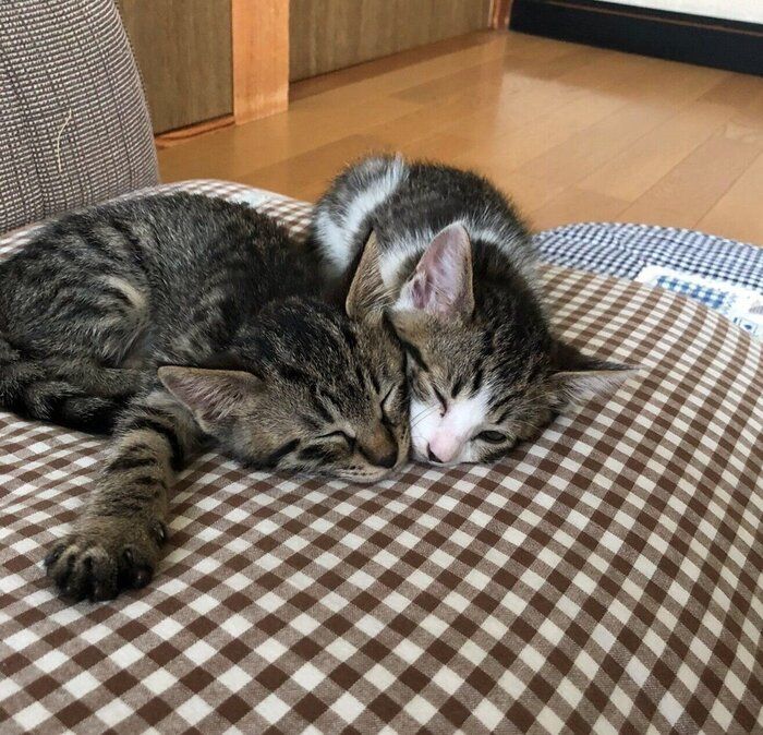 ぐっすり眠る様子がなんとも可愛らしい2匹ですが、気になるのが2匹の体勢。飼い主さんによると、ふと見たらよもぎちゃんがなぎくんの上に覆い被さっていたのだとか!